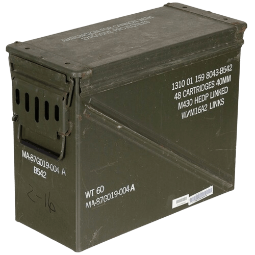 Avtentični kovinski zaboj NATO, namenjen za shranjevanje streliva.