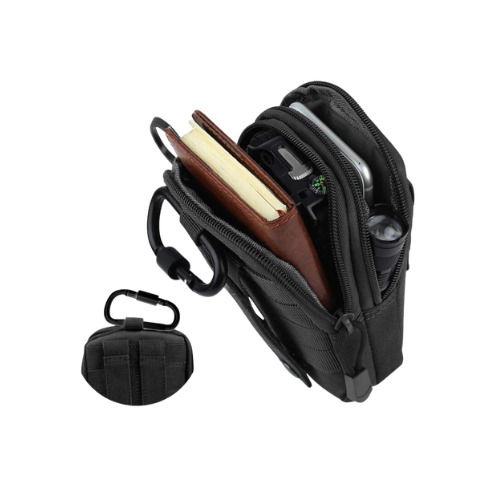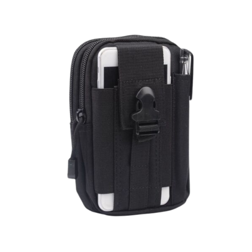 Taktična torbica za pas v črni barvi je praktična in zanesljiva rešitev za prenašanje osnovne opreme. Primerna je za vsak dan ali aktivnosti na prostem.