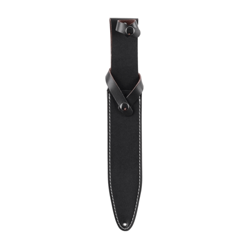 Nožu je priložena kakovostna nožnica iz naravnega usnja, ki se zapira z dvema kovinskima zaponkama in omogoča varno ter udobno nošenje na pasu.