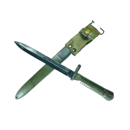 Priložen je plastični etui z kovinsko notranjostjo ter platnenim paščkom za nošenje bajoneta za pasom.