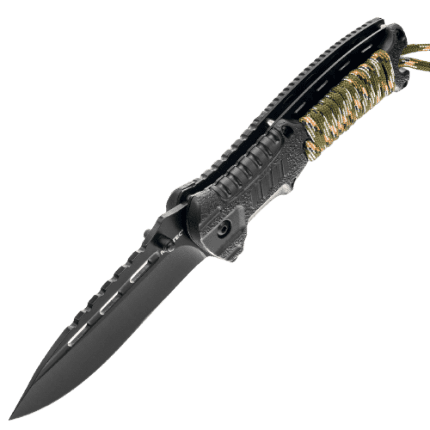 Klasičen taktični vojaški nož , ki bo idealno orodje pri taktičnih nalogah, odličen pa tudi med ekspedicijami za preživetje. Vojaški nož ima tradicionalno obliko , ki bo všeč vsem oboževalcem vojske. Rezilo za vpenjanje je izdelano iz visokokakovostnega nerjavečega jekla 420. Ta material je izjemno trpežen in odporen na poškodbe. Dodatno je prekrit s črnim oksidom, ki zmanjšuje učinek odboja in ima visoke antikorozijske lastnosti. Nož ima ergonomsko profiliran ročaj , ki se popolnoma prilega roki. Izdelan je iz gume, ki odlično deluje tudi v slabih vremenskih razmerah.